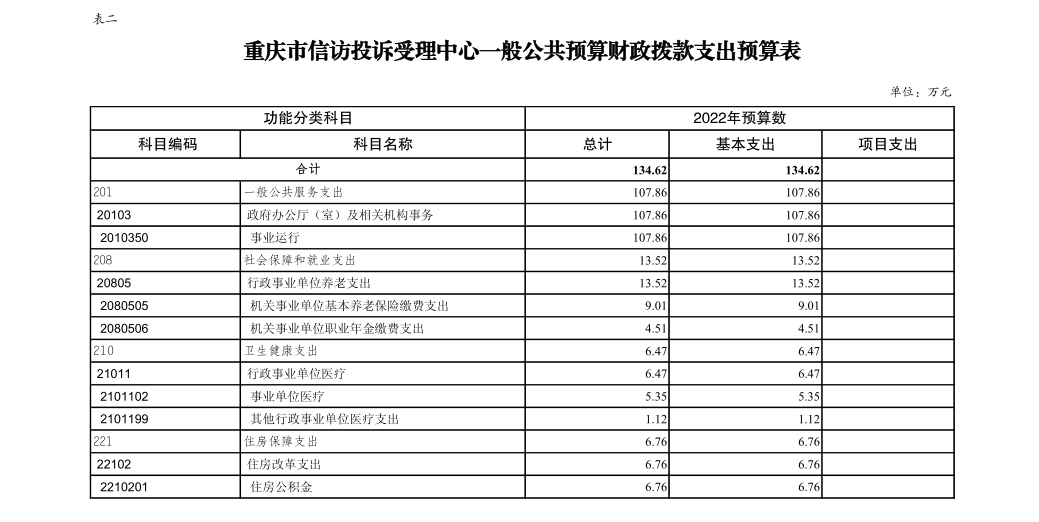 (二)支出预算:2022年年初预算数134.62万元,其中:一般公共服务支出预算107.86万元,教育支出预算0万元,社会保障和就业支出预算13.52万元,卫生健康支出预算6.47万元,住房保障支出预算6.76万元;支出预算较去年增加11.59万元,主要是基本支出增加11.59万元。